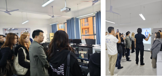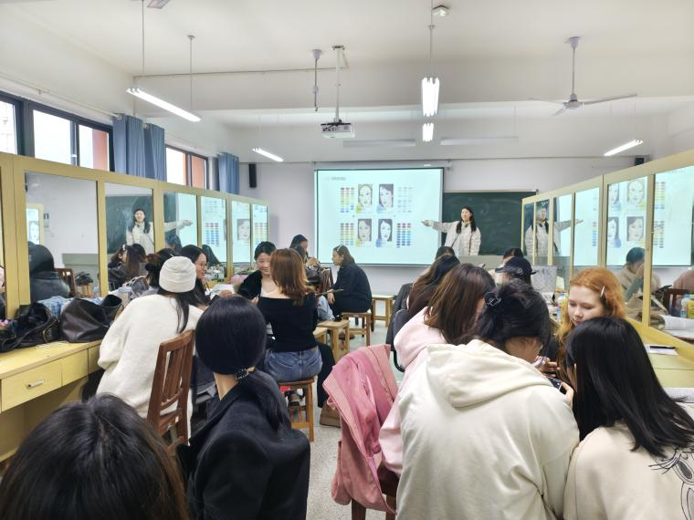 活动中,留学生首先走进“传统配色与妆容结合应用设计”课堂。该课程聚焦湖湘传统服饰色彩体系与妆容艺术的融合创新,教师通过现场演示与互动讲解,展示了如何将传统色彩美学运用于现代妆容与服饰搭配中。留学生在专业教师的指导下,亲身体验了传统妆容的设计过程,感受色彩、纹样与面部造型的和谐统一,深刻体会到传统文化在现代设计中的生命力。