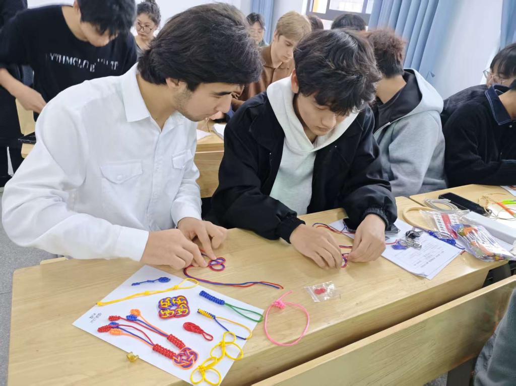 随后,留学生们前往“湖湘服饰非遗技艺传承基地”,参与“传统非遗手工艺编织”课程体验。专业教师通过实物展示与技艺讲解,系统介绍了湖湘地区传统编织工艺的历史渊源与技艺特点。留学生在教师的耐心指导下,动手尝试编织技艺,亲手制作具有湖湘特色的编织手工艺品,在实践中加深了对非遗技艺的理解与认同。